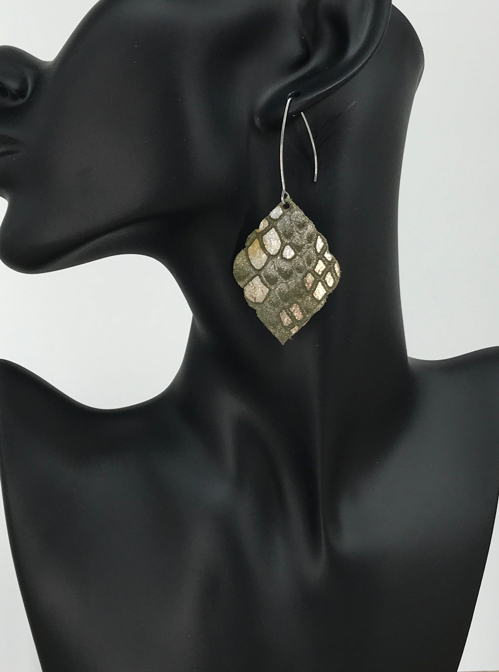 Mystic Multi Bronze on Khaki Green Python Snake Leather Earrings with Stainless Steel Ear Wires.