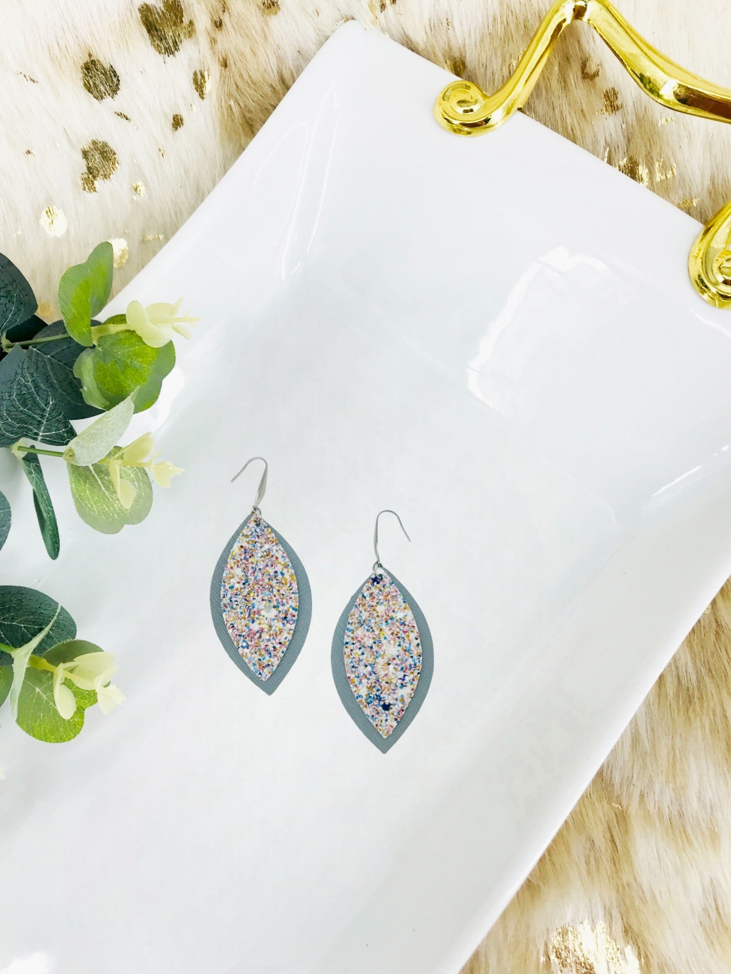 Neutral Gray Genuine Leather and Chunky Glitter Earrings - E19-725