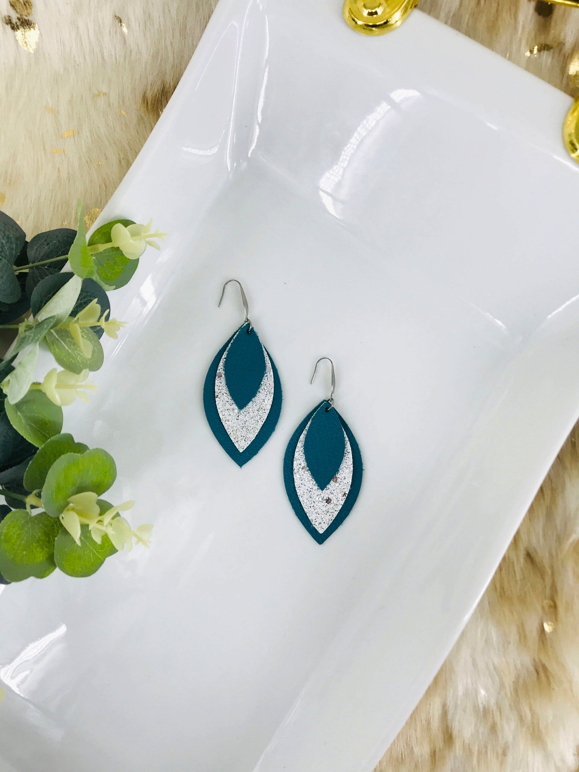 New Dark Turquoise Divine Leather and White Glitter Layered Earrings with Stainless Steel Findings and Ear Wires.