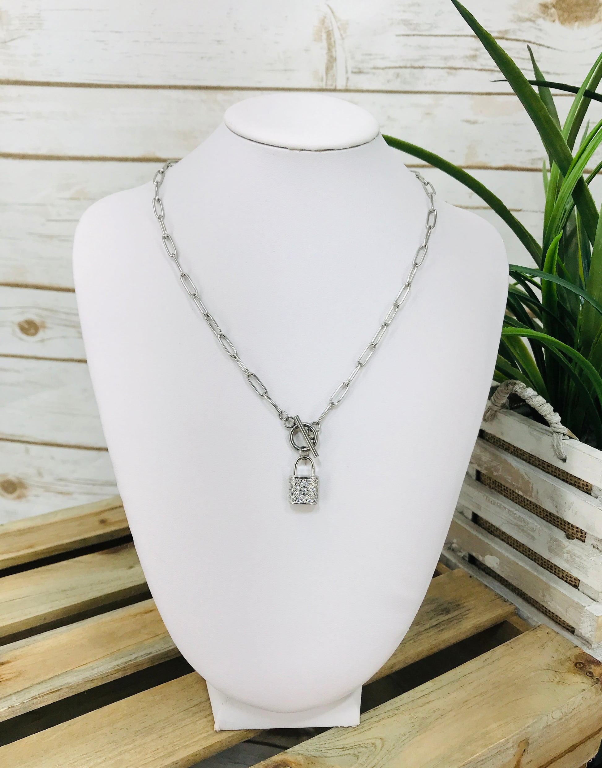 Paperclip & Pave Lock Pendant Necklace - N726