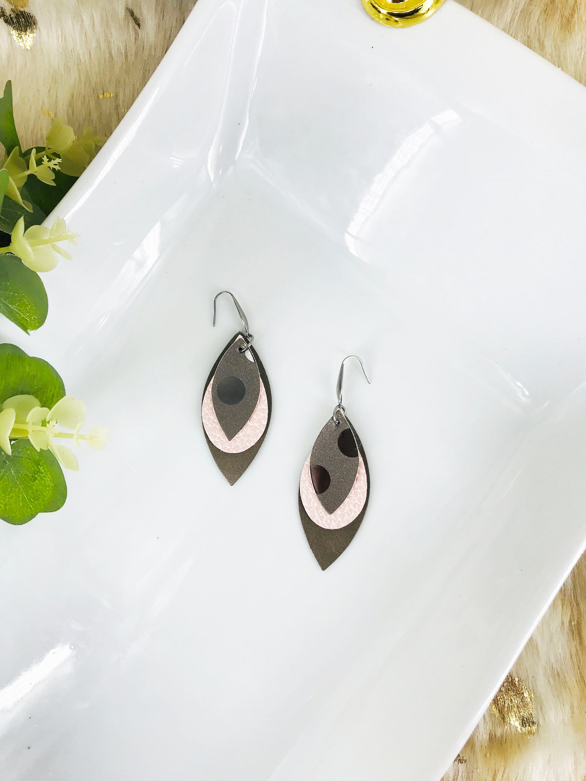 Pewter Dots and Pretty In Pink Layered Faux Leather and Leather Earrings with Stainless Steel Findings and Ear Wires.