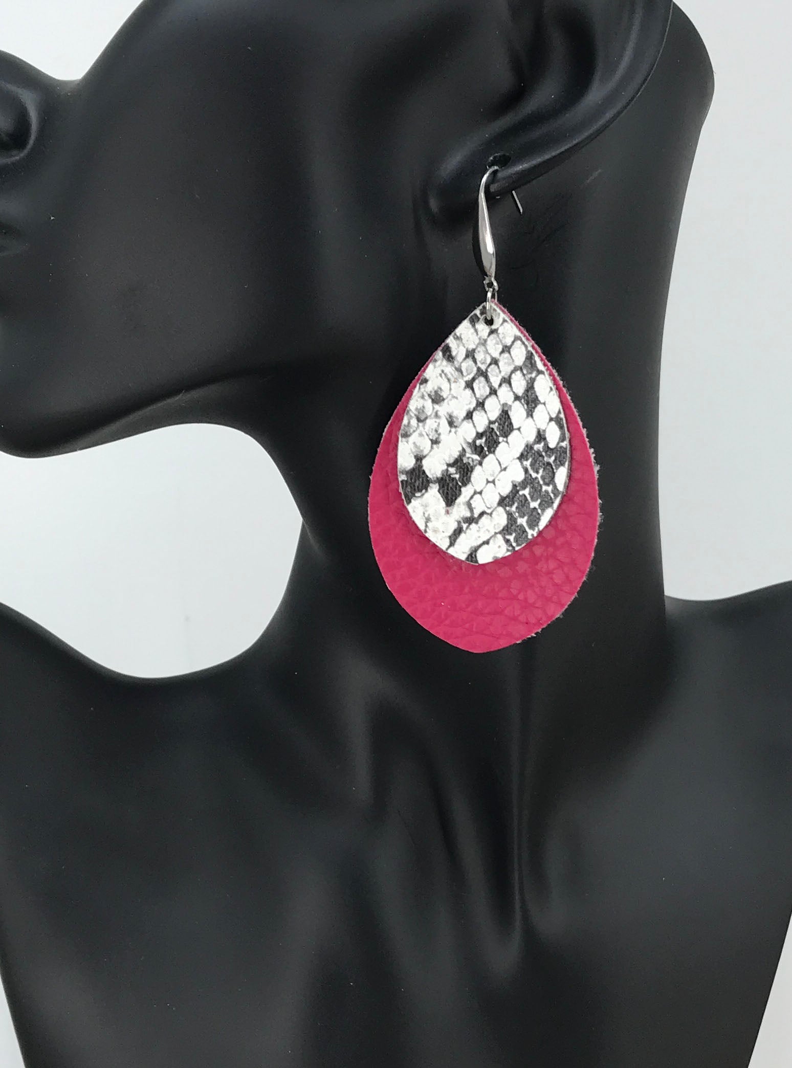 Pink Solid Litchi Grain Texture Faux Leather and Black and White Snake Faux Leather Earrings with Black and Pink Find Glitter Backing and Silver Tone Stainless Steel Findings and Ear Wires.