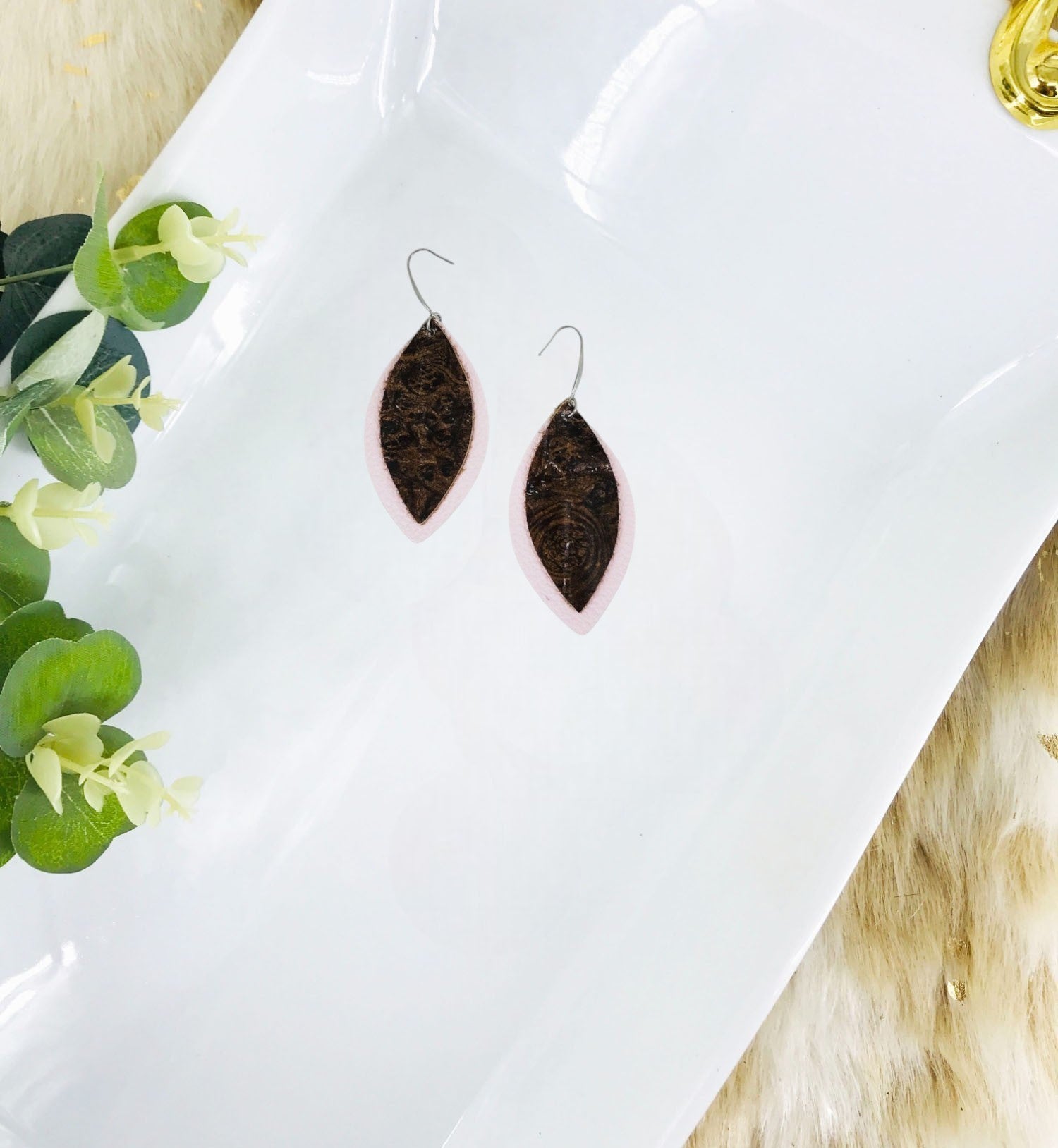 Baby Pink Divine Leather and Burlwood Crocodile Belly Leather Earrings with Stainless Steel Findings and Ear Wires.
