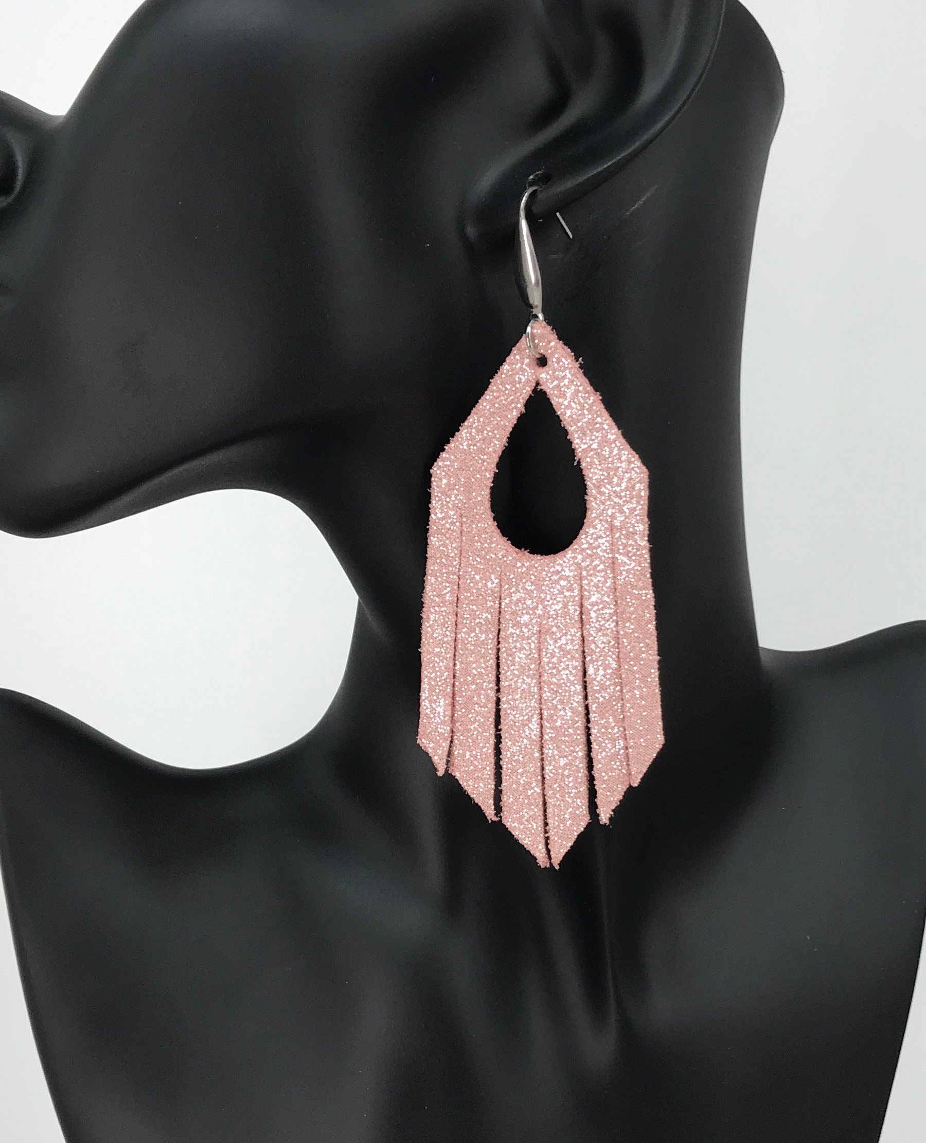 Dazzle Silver on Pink Lemonade Frayed Leather Earrings with Stainless Steel Findings and Ear Wires.