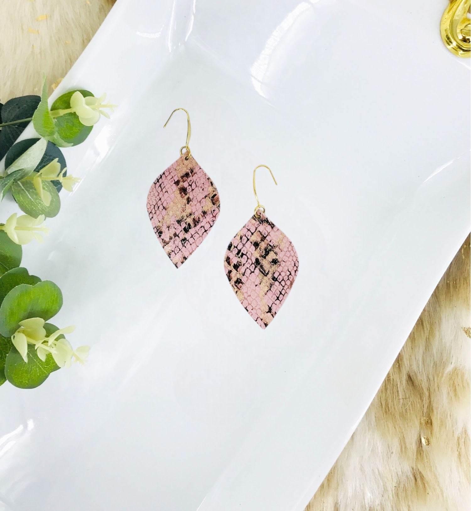 Pink Snake Skin Leather Earrings with Gold Tone Stainless Steel Findings and Ear Wires.