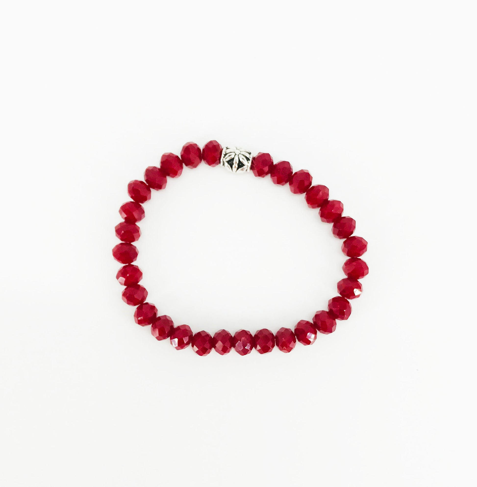 8" Red Glass Bead Stretchy Bracelet made of 10mm or 8mm Glass Beads and designed locally and hand stung on a generous length of thick stretch cord.