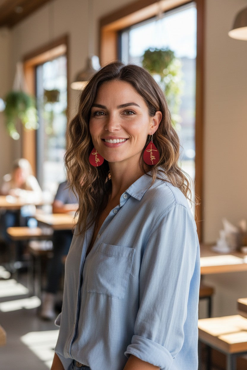 Cranberry Genuine Leather and Gold Glitter "Faith" Earrings with Gold Tone Stainless Steel Findings and Ear Wires.