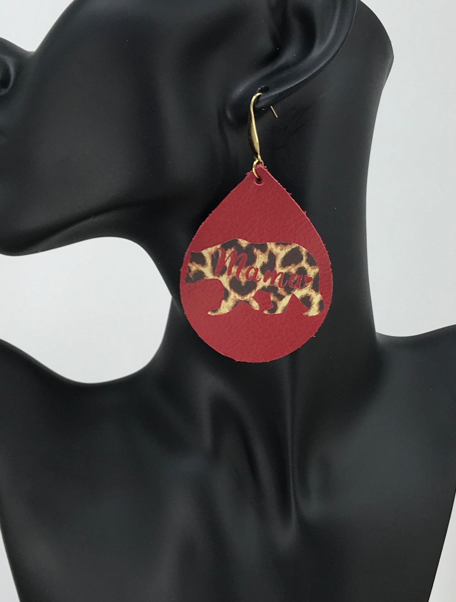 Red Leather "Mama Bear" Cheetah Print Earrings - E19-1309
