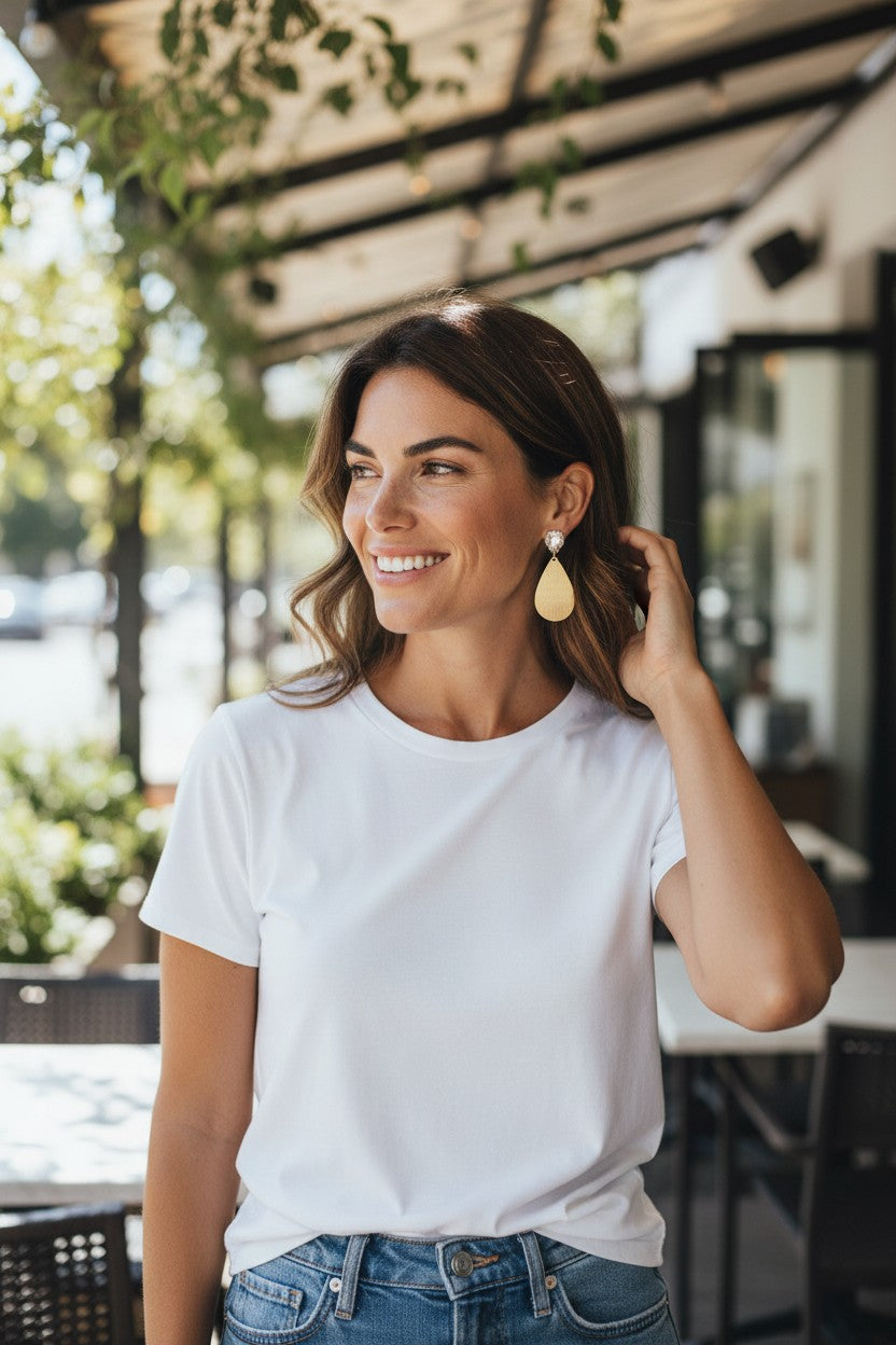 Clear Glass Rhinestone 18K Gold Stud & Brushed Gold Teardrop Pendant Earrings.