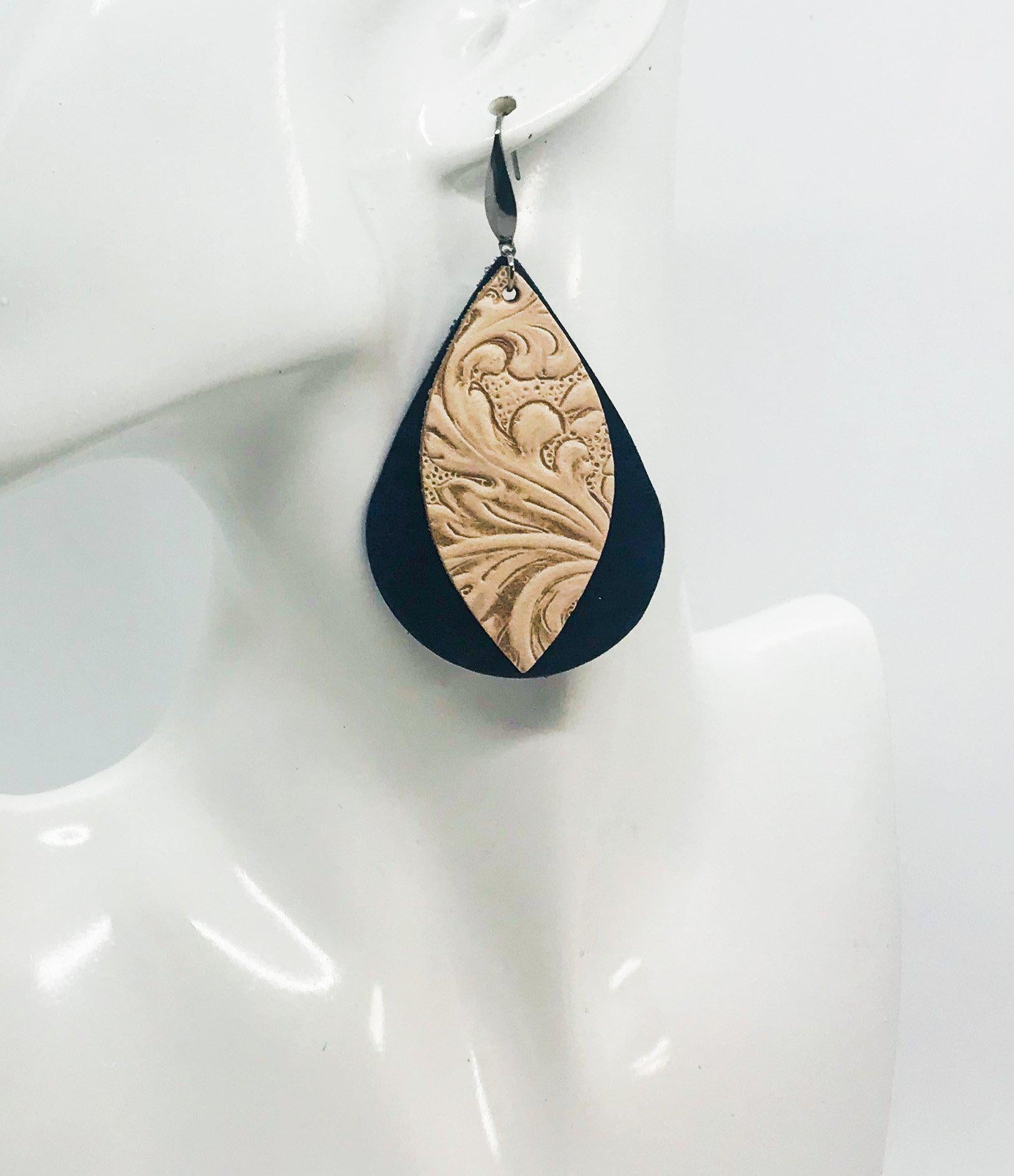 Wrinkly Royal Blue Leather and Natural Embossed Acanthus Pattern Leather Earrings with Stainless Steel Findings and Ear Wires.
