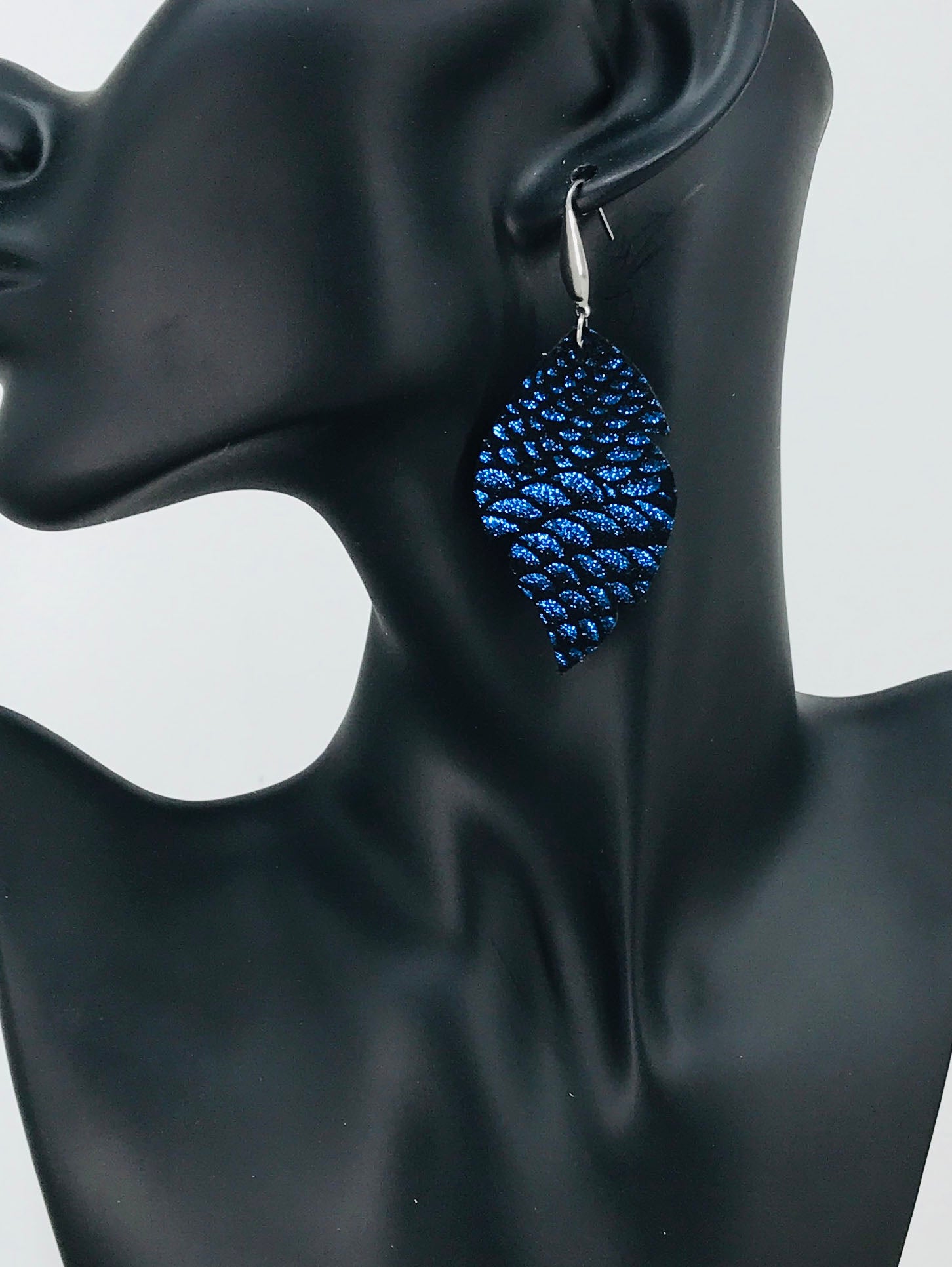 Royal Blue Chinese Dragon Metallic Leather Earrings with Stainless Steel Findings and Ear Wires.