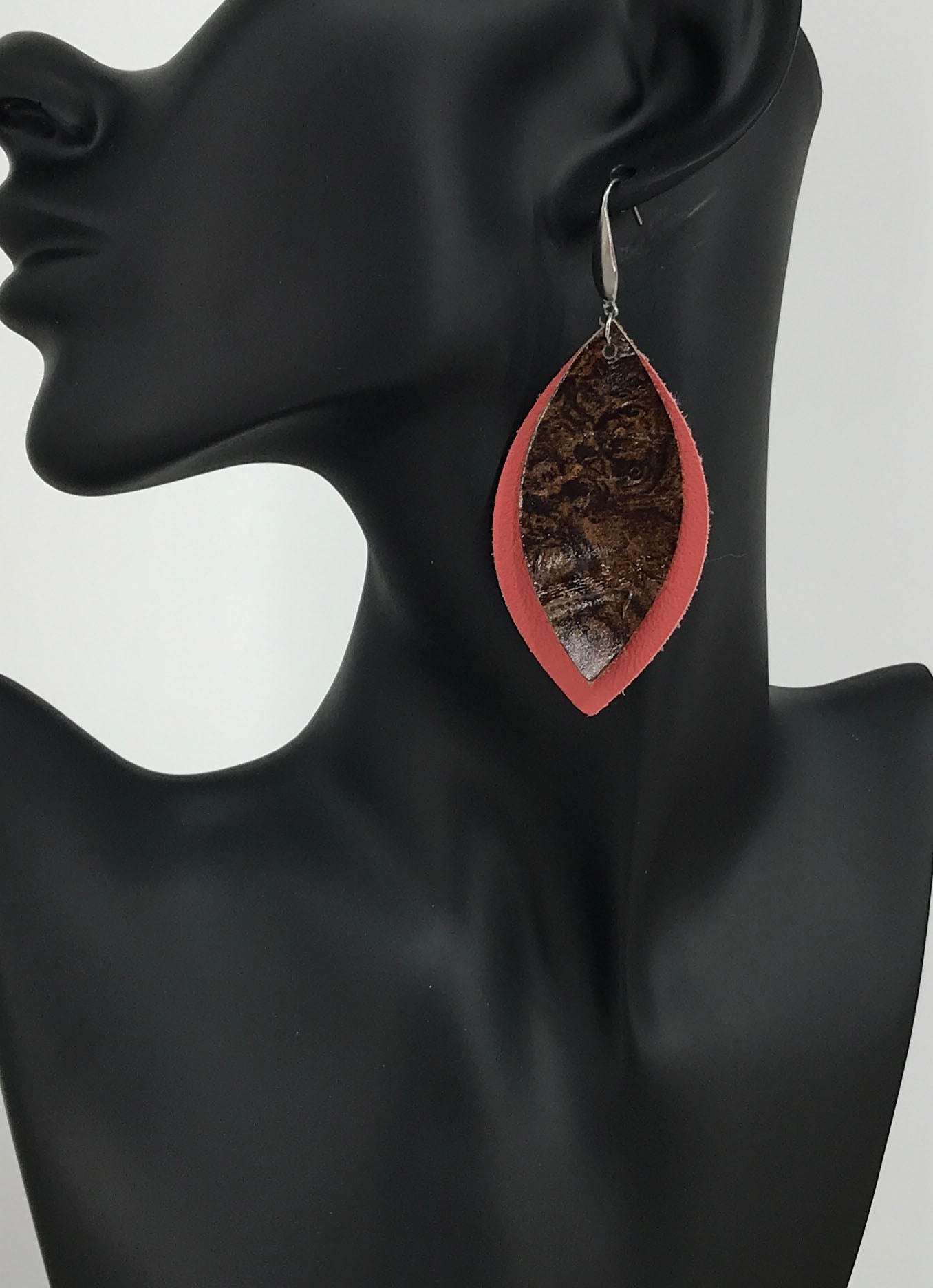 Salmon Plonge Leather and Burlwood Crocodile Belly Leather Earrings with Stainless Steel Findings and Ear Wires.