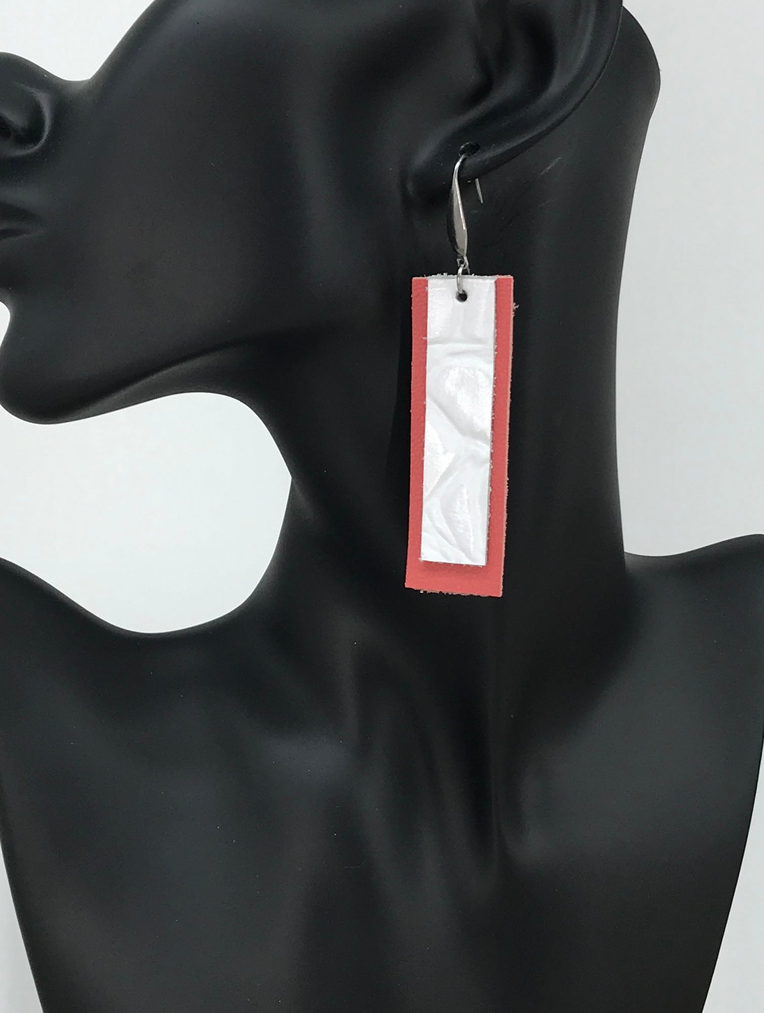 Salmon Plonge Leather and White Embossed Alligator Leather Earrings with Stainless Steel Findings and Ear Wires.