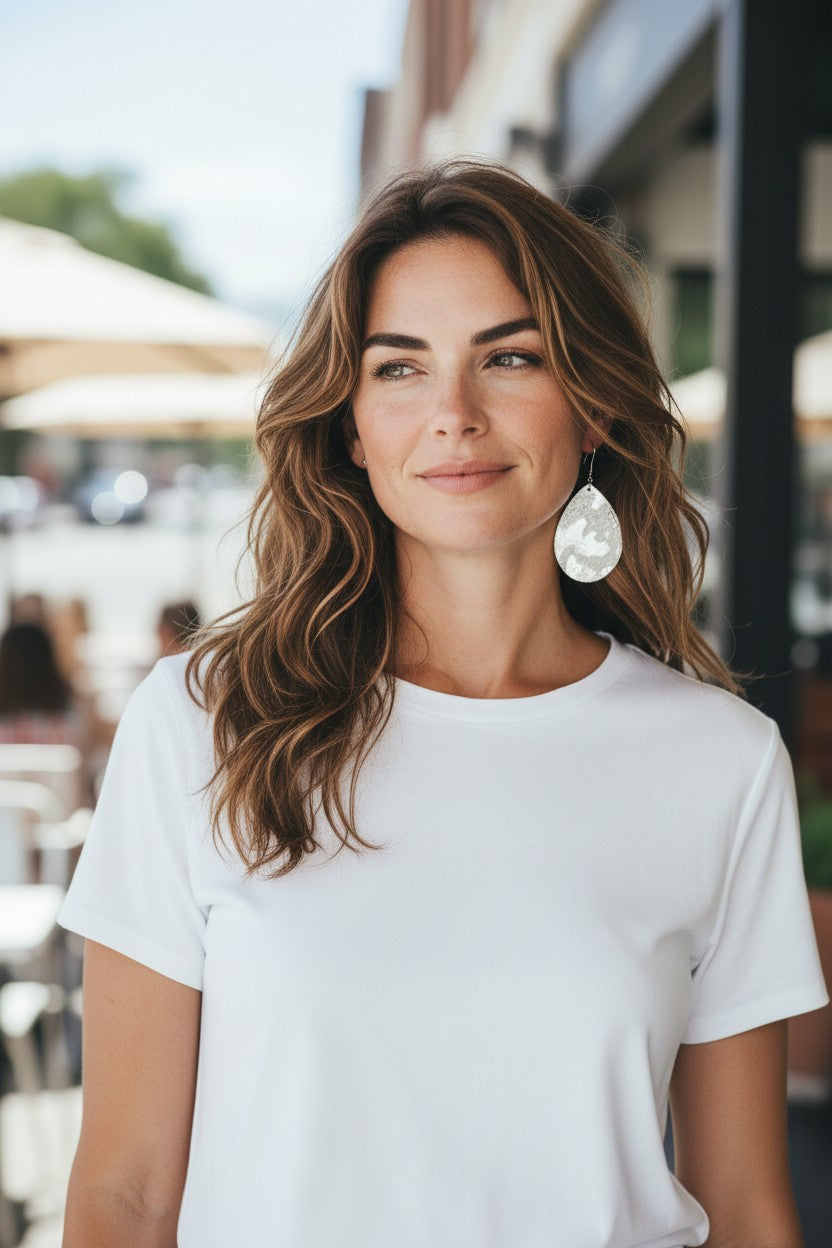 Silver Acid Wash Hair On Leather Earrings with Silver Tone Stainless Steel Findings and Ear Wires.