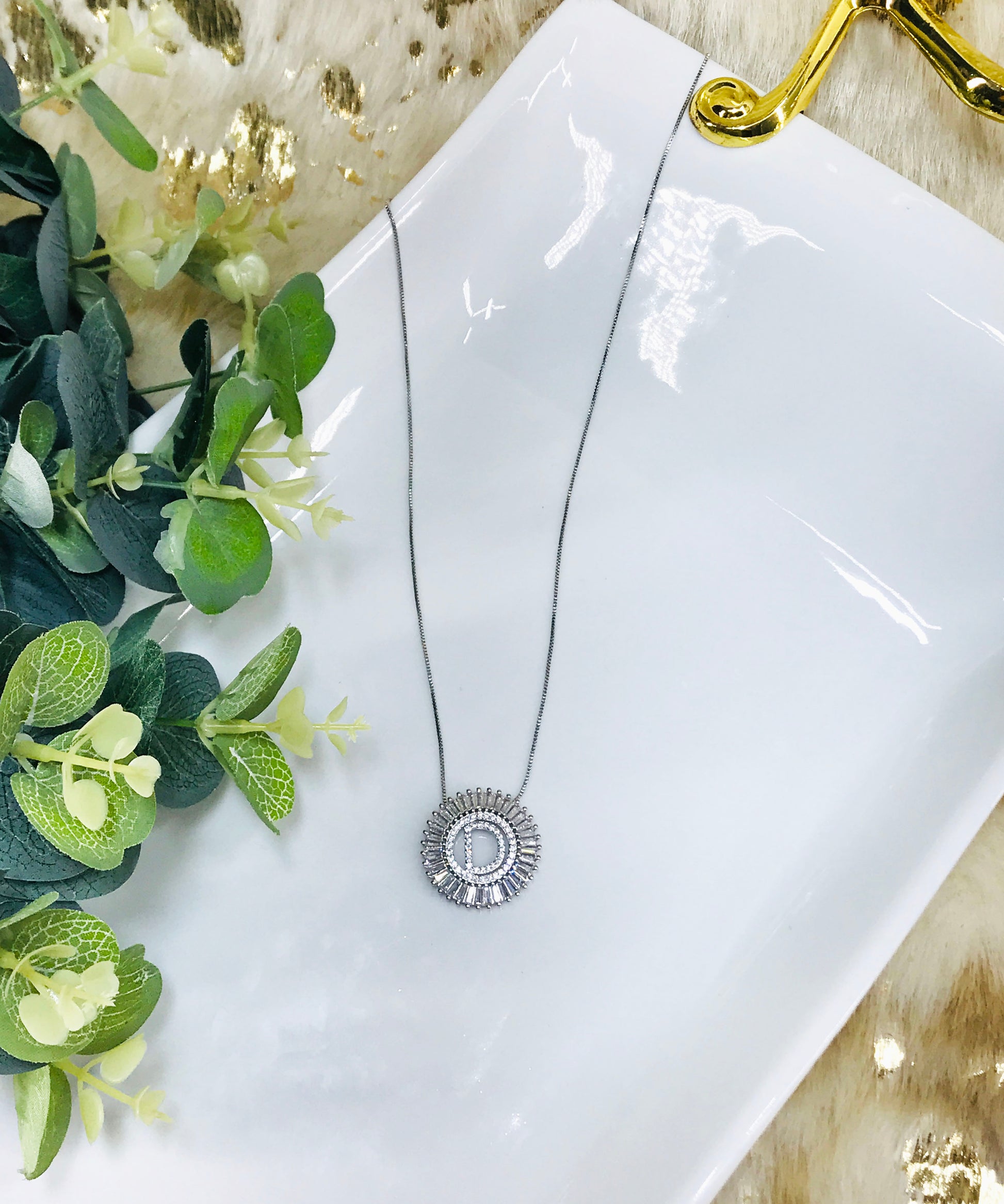 17" Clear Rhinestone Initial Necklaces in a Silver Tone Setting with Lobster Claw Clasp Closure and 2" Extender.