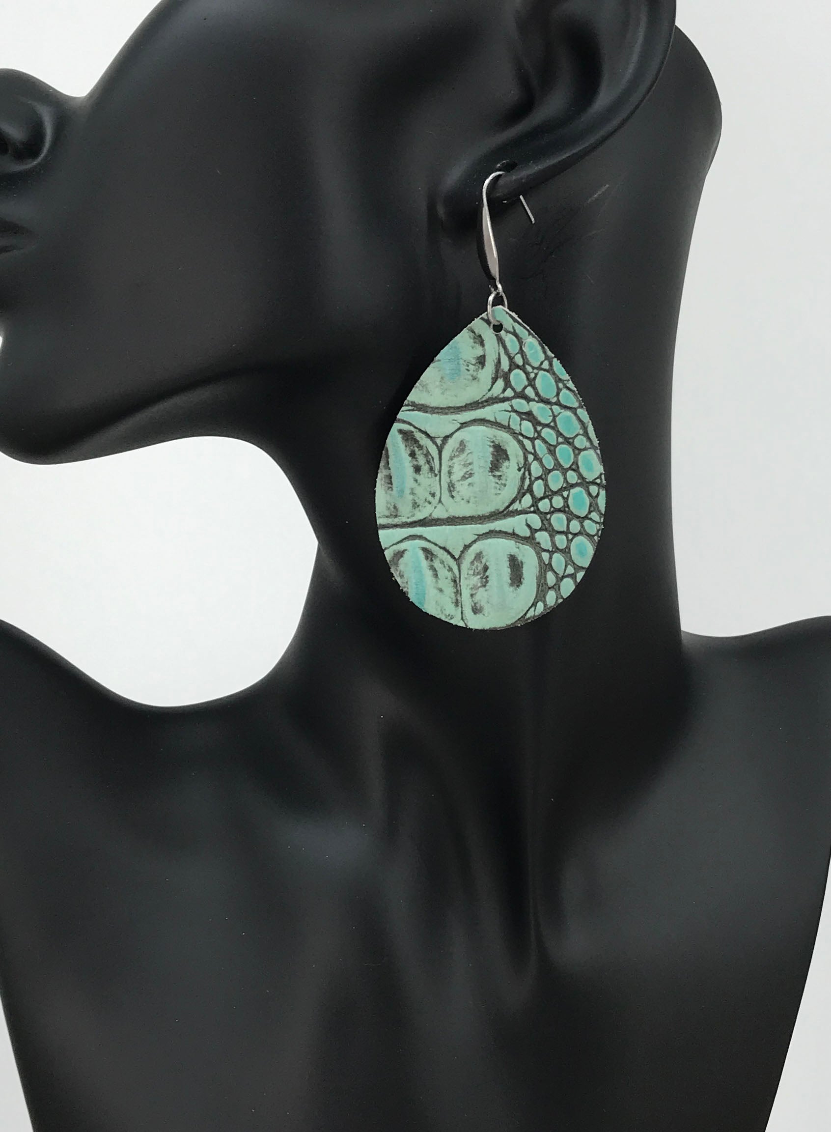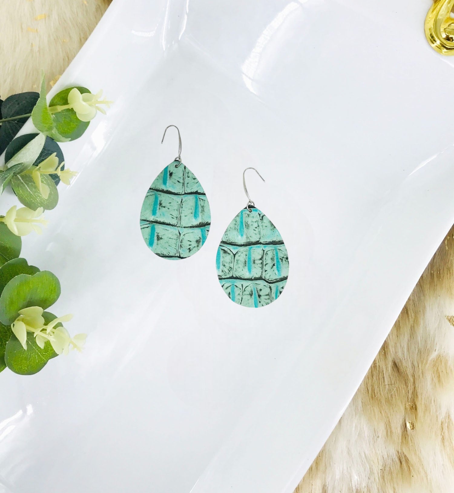 Antique Turquoise Alligator Leather Earrings with Silver Tone Stainless Steel Findings and Ear Wires.