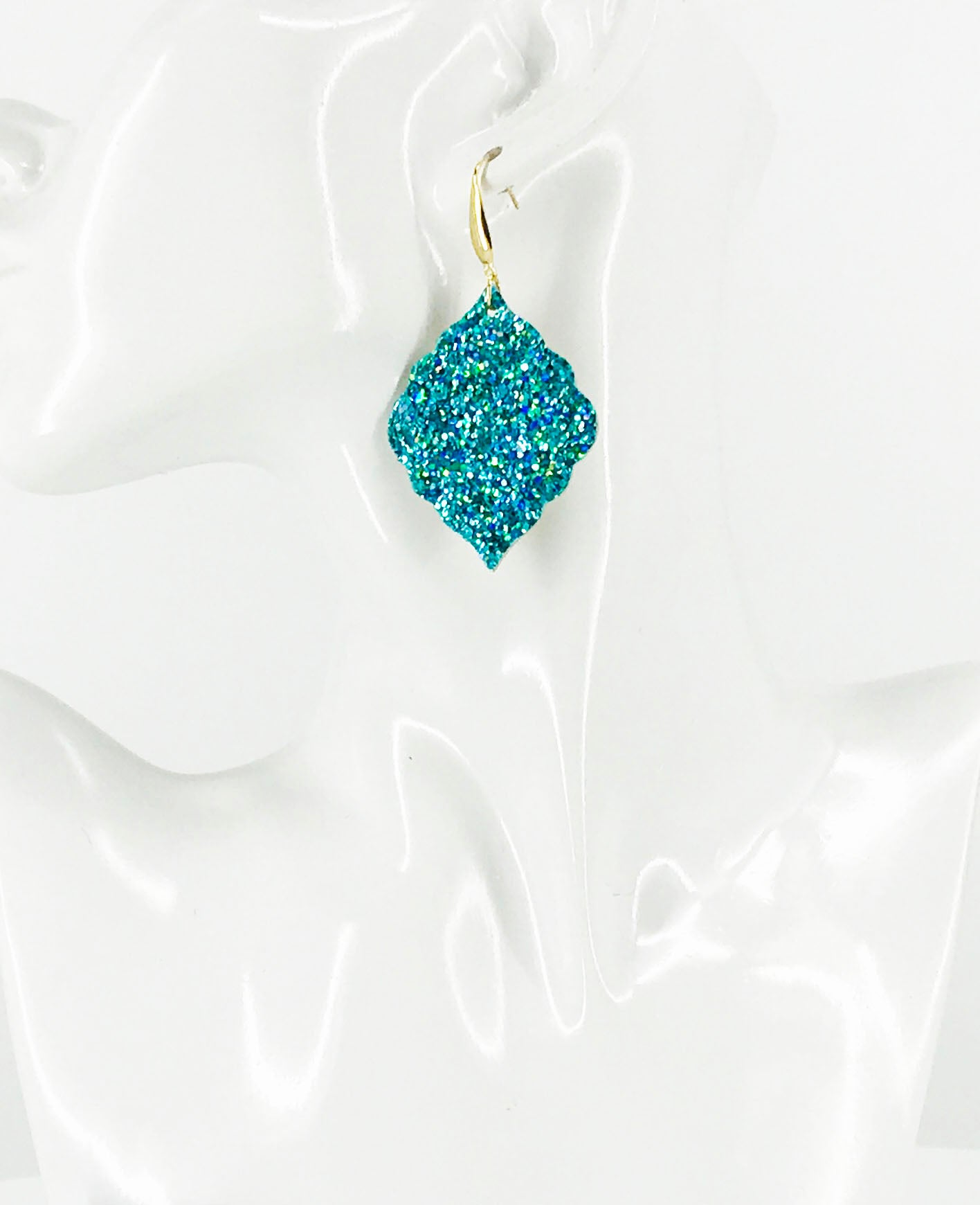 Turquoise Chunky Glitter on Leather Earrings with Gold Tone Stainless Steel Findings and Ear Wires.
