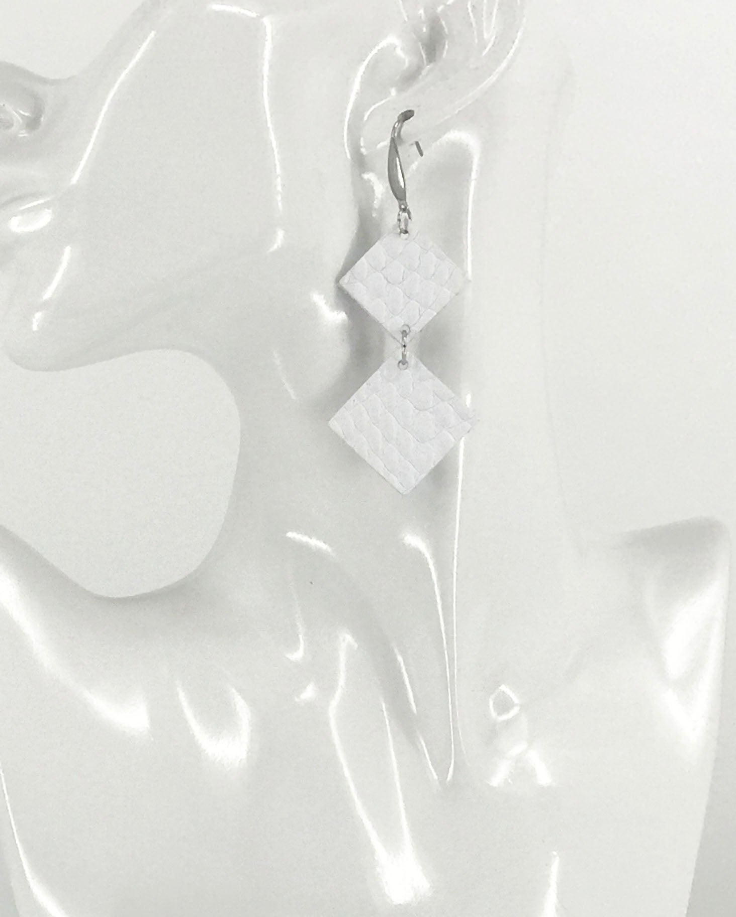 Matte White Amazon Cobra Leather Earrings with Silver Tone Stainless Steel Findings and Ear Wires.