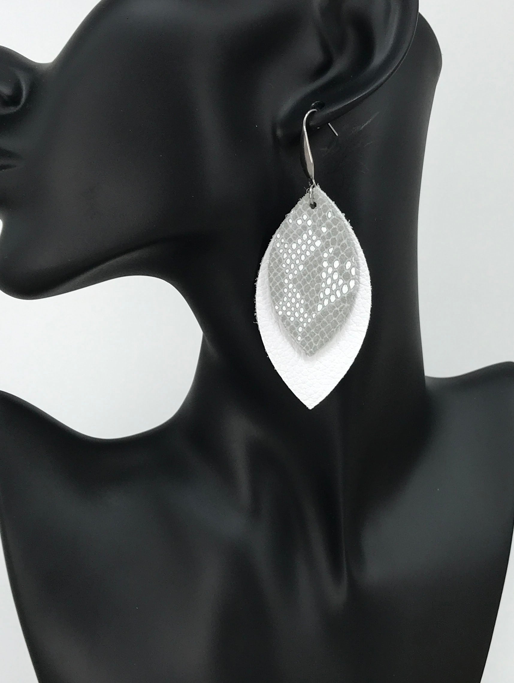 Divine Bright White Genuine Leather and White Frost on Sterling Gray Snake Leather with Stainless Steel Findings and Ear Wires.
