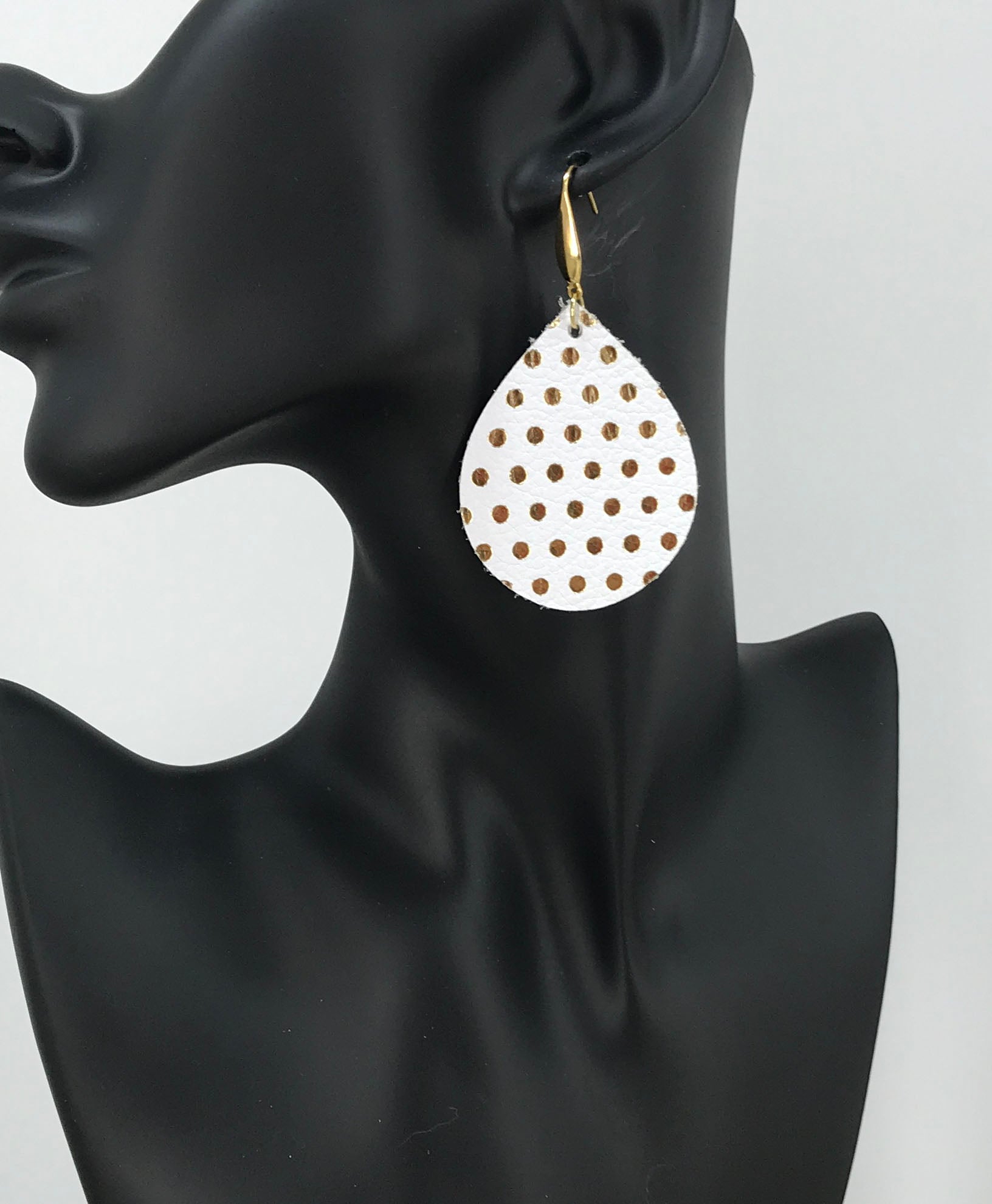 White Metallic with Gold Polka Dot Leather Earrings with Stainless Steel Findings and Ear Wires.