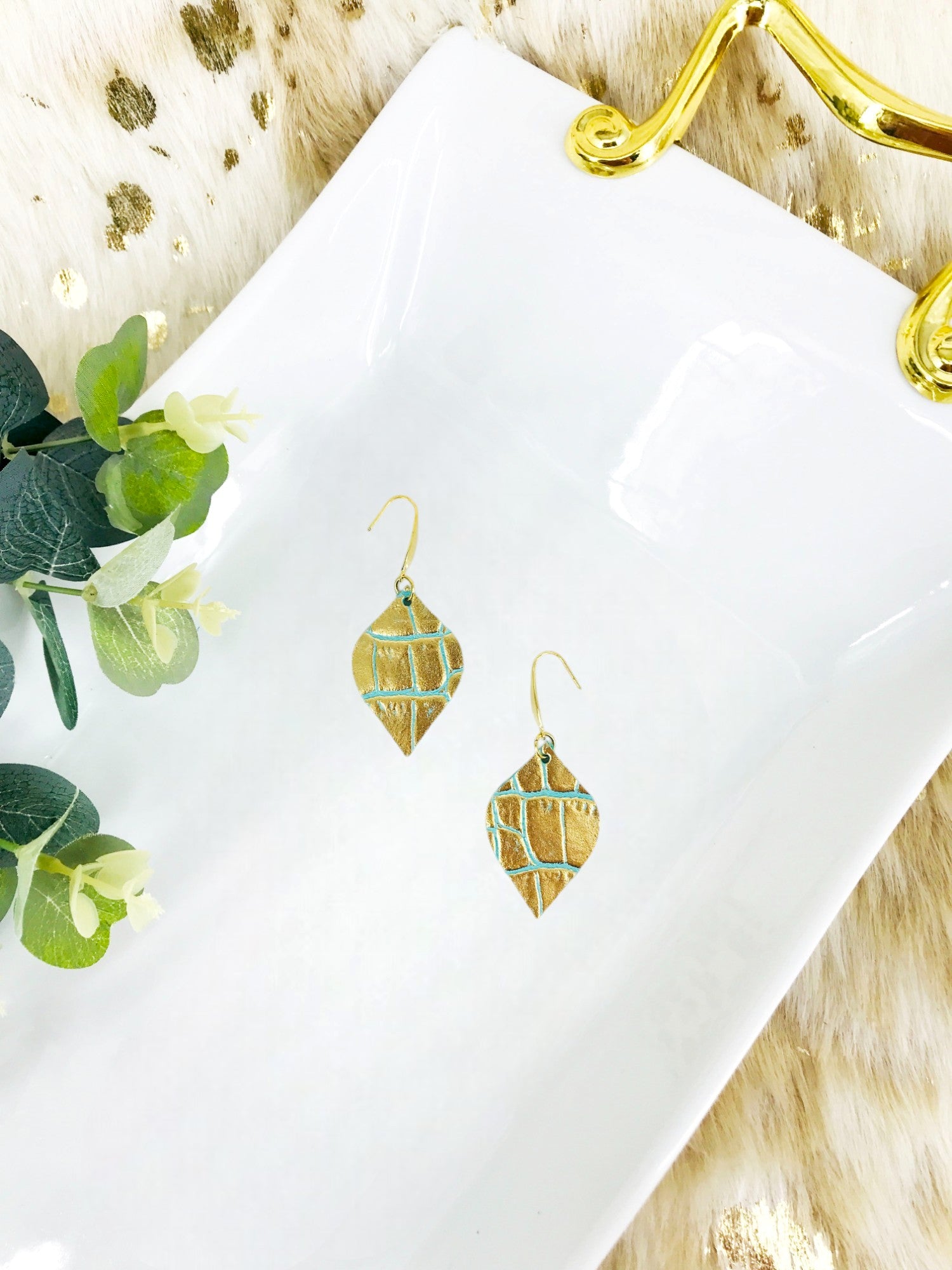 Gold Metallic Teal Crocodile Leather Earrings with Gold Tone Stainless Steel Findings and Ear Wires.